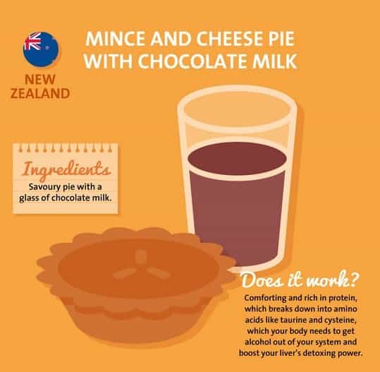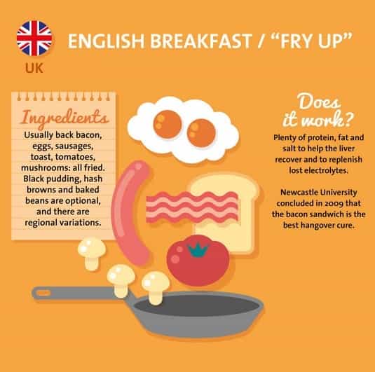 ¿Saliste a a carretear anoche y despertaste con la media caña? Bueno, no eres el único y este post lo demuestra de manera gráfica. Cada país tiene su propio secreto para terminar con el hachazo, por lo que si la receta de siempre ya no da resultados, te dejamos esta lista para que pruebes algunas nuevas formas de combatir la resaca. Reino Unido: Después de la jarana, los británicos suelen recuperarse con un buen desayuno a base de huevos, tocino, salchichas y champiñones, lo que ayuda a que los niveles de que los niveles de los electrolitos del cuerpo se recuperen. En el 2009 la Universidad de NewCastle llegó a la conclusión de que la mejor cura para la caña es el sandwich de tocino.