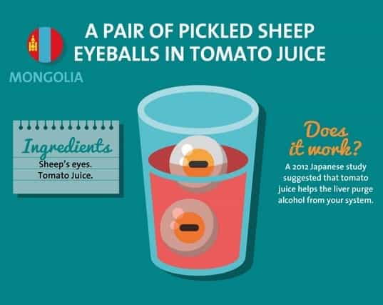 Mongolia: Esta es algo asquerosa. Los mongoles recurren a los ojos de oveja bañados en jugo de tomate. En el 2012 un estudio hecho en Japón determinó que el jugo de tomate purga el alcohol de nuestro sistema.