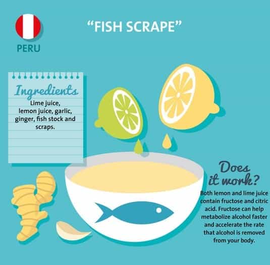 Perú: Nuestros vecinos peruanos, sostienen que el jugo limón, con zumo de lima, ajo, jenjibre y caldo de pescado mata la caña. ¿Qué hace esto tan efectivo? El jugo de limón y la lima ayudan a metabolizar el alcohol.