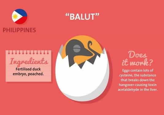 Filipinas: Los filipinos recurren a una fórmula tan asquerosa, que creo que es mejor aguantarse la caña que probarla. Un huevo de pato. Un embrión de pato.