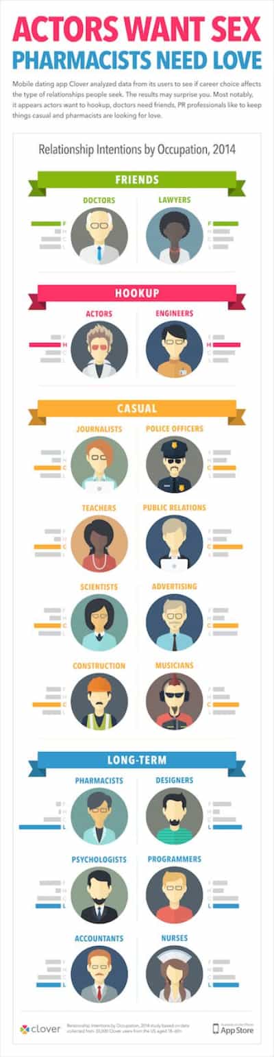 Un estudio realizado por la aplicación para citas Clover, demostró que la profesión de cada persona influye a la hora de buscar pareja. Por ejemplo, los médicos y los abogados tienen más probabilidades de estar buscando amistad, mientras que los periodistas y profesores prefieren encuentros casuales. Esta encuesta fue realizada a 33 mil usuarios, entre hombres y mujeres de 18 a 60 años. Ve el detalle en la siguiente infografía: