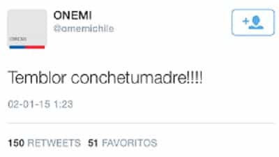 Otro troll de la ONEMI: @omemichile Parece que desde el terremoto del 2010 que a este organismo no lo dejan en paz, y tiene otro troll popular más con más de 4 mil seguidores y siguiendo sólo a 16.