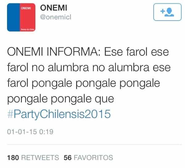 Cuenta troll de la ONEMI: @onemicl La Oficina Nacional de Emergencia del Reino de Chile también es bastante popular, teniendo más de 11 mil seguidores y siguiendo sólo a 8. La ONEMI siempre fue una de las instituciones más trolleadas en Twitter y ahora tiene su propia cuenta parodia que se dedica a dar informaciones de última hora.