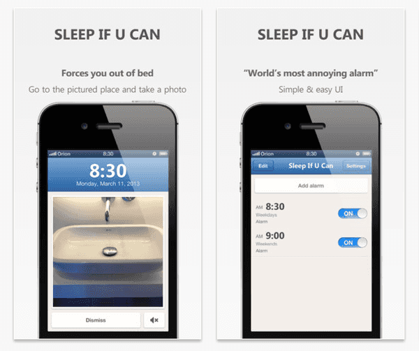 Si eres de esos que pasaba llegando tarde al colegio y no hacía muchos esfuerzos por remediar la situación, debes tener en cuenta que en la U es "sin llorar" y hay profes que simplemente no te van a dejar entrar a su clase si llegas atrasado. Con Sleep if U Can puedes hacer un cambio, ya que esta app puede llegar a ser un poco más "catete" que tu mamá, para lograr que finalmente te levantes. La alarma te obliga a levantarte y e ir a lugar específico de tu casa (definido por ti), para tomarle una foto y así poder desconectarla. Está disponible para Android (para Android existe una versión gratuita) e iOS (con un valor de 1.99 USD).