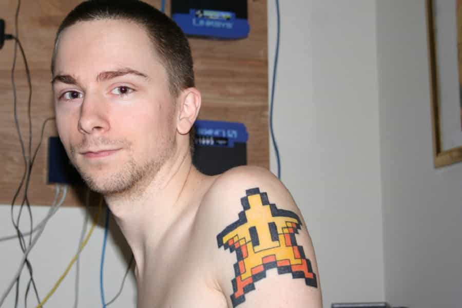 Imagen CC XLShadow La estrellita que te hacía invisible a lo largo de la trayectoria de Mario, retratada en un lindo tatuaje estilo pixel. Estos tatuajes están en voga en cuanto a lo que a tinta se refiere.