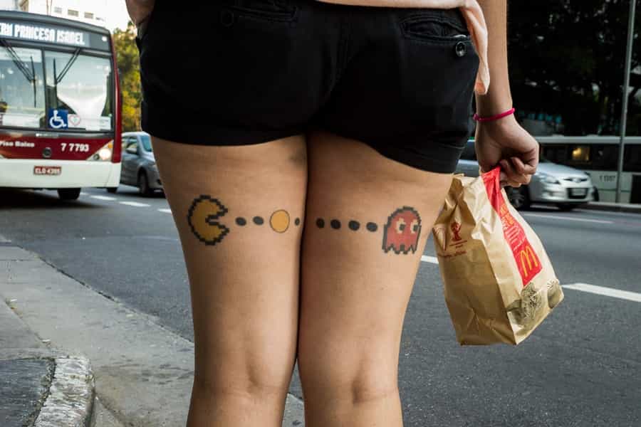 Antes de que Shakira sacara a relucir su "Waka Waka" y nos dejara hasta la coronilla con su famoso hit, los gamers sabíamos que cuando se hablaba de "Waka Waka" se hablaba de Pac Man (por el sonido característico del personaje principal al comer). El tattoo de la foto es bastante original, porque utiliza 2 partes del cuerpo para hacer una sola composición.