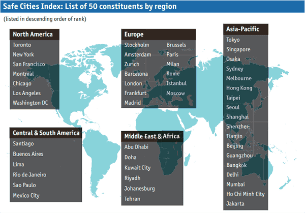 Un reciente estudio elaborado por The Economist, analizó 50 ciudades del mundo y las ordenó de acuerdo a sus índices de seguridad sanitaria, seguridad de infraestructuras, seguridad personal y seguridad digital. De esta forma y con la ayuda de un panel internacional de expertos, la publicación dejó a Santiago de Chile como la ciudad más segura de Centroamérica y América del Sur. Le siguen dentro de la región, Buenos Aires y Lima.