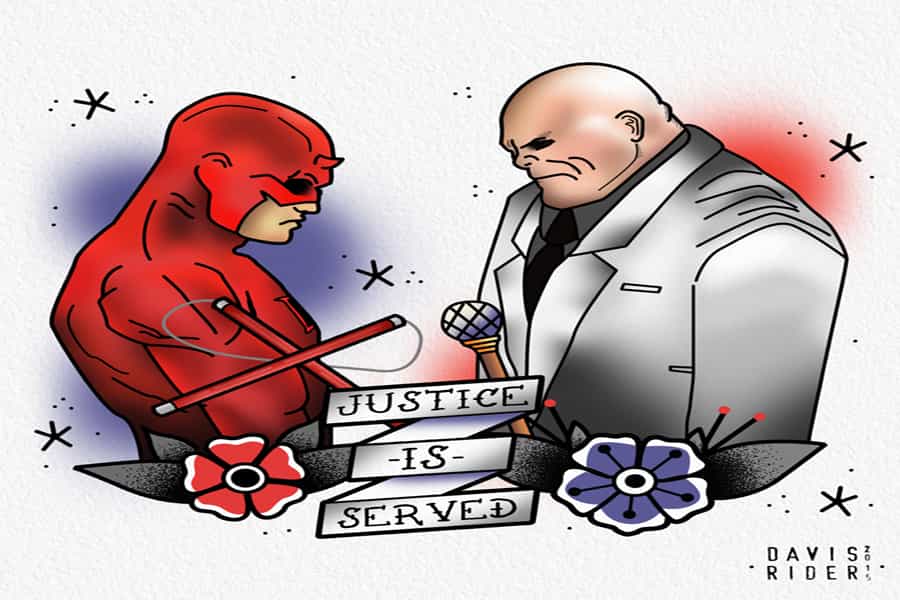 El abogado ciego que en su tiempo libre es un justiciero, es alguien a quien seguramente muchos admiran. Su noble labor tratando de erradicar el crimen de la ciudad desde todos los puntos a su alcance, lo establece como un súper héroe digno de llevar en la piel. Esta ilustración representa uno de los momentos claves en la vida de este personaje, en el que se encuentra frente a su más acérrimo enemigo: Kinpig.