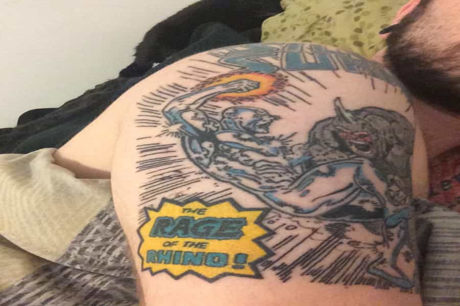 En este tatuaje, Silver Surfer está en un enfrentamiento entre él y Rhino, casi como en una viñeta sacada de un cómic.