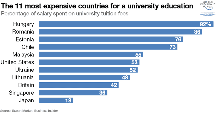 De acuerdo al estudio publicado por el sitio World Economic Forum, que realizó un cálculo entre el promedio de ingresos familiares y los costos de la educación universitaria de cada país, Chile se ubica en el 4° lugar de la lista de países OCDE donde sale más caro ir a la universidad