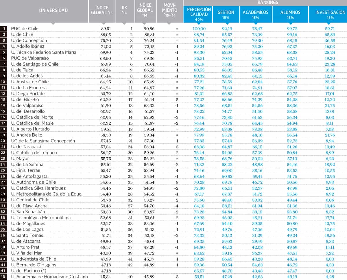 Las tres instituciones que quedan a la cabeza del listado en su edición 2015, son la Pontificia Universidad Católica, la Universidad de Chile y la Universidad de Concepción. Le sigue la Universidad Adolfo Ibáñez, que se queda con el cuarto lugar y desplaza al quinto a a la Universidad Técnica Federico Santa María.